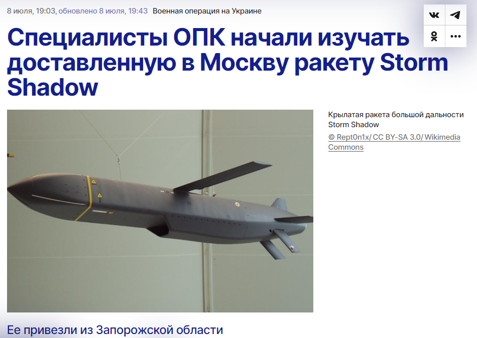 (觀察者網訊)據俄羅斯塔斯社7月8日報道,俄國家航天集團公司前負責人、現任“沙皇狼”(Царские волки)軍事顧問團團長的羅戈津表示,俄羅斯國防工業專家開始着手研究被俄軍擊落的“風暴陰影”導彈(Storm Shadow),該導彈此前被從扎波羅熱地區運抵莫斯科。