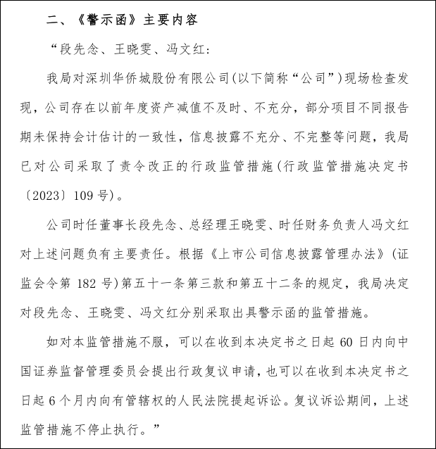 (文/張志峯 編輯/馬媛媛)7月12日晚間,華僑城發佈公告稱,公司及相關人員於近日收到中國證券監督管理委員會深圳監管局出具的《深圳證監局關於對深圳華僑城股份有限公司採取責令改正措施的決定》、《深圳證監局關於對段先念、王曉雯、馮文紅採取出具警示函措施的決定》。