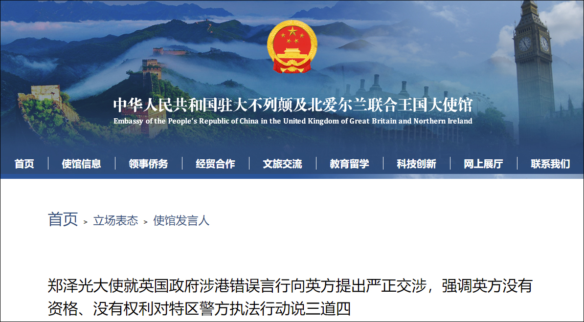 據中國駐英國大使館網站消息,7月13日,中國駐英國大使鄭澤光約談英國外交發展部官員,就英方在涉港問題上的錯誤言行提出嚴正交涉,表達強烈不滿和堅決反對,強調英方沒有資格、沒有權利對特區警方執法行動説三道四,敦促英方認清形勢,糾正錯誤,停止干涉香港事務和中國內政。