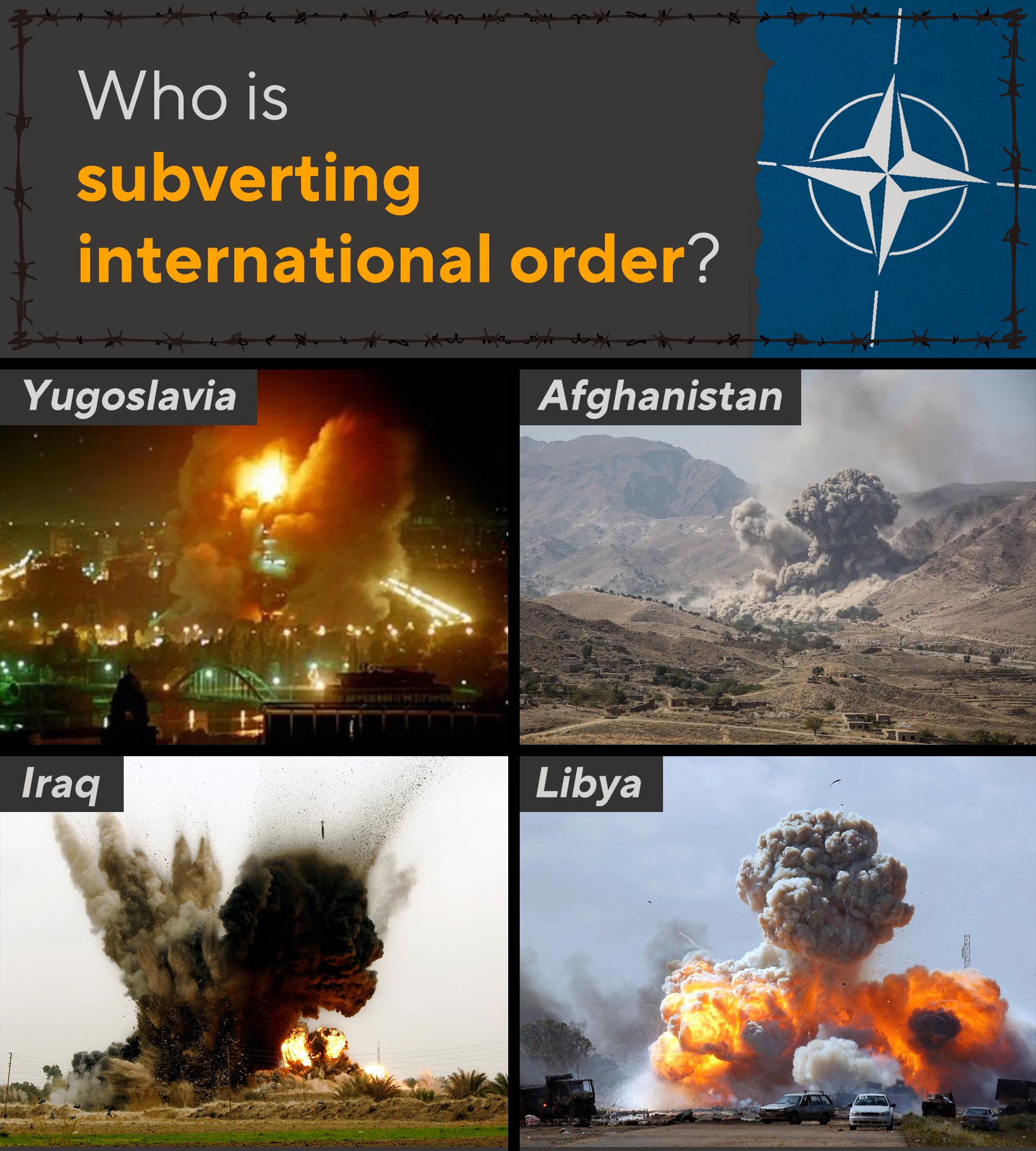 對此,中國外交部部長助理、發言人華春瑩連發數條推文,對這份北約峯會報告予以嚴正駁斥。其中,她發佈了一張包含南斯拉夫、阿富汗、伊拉克和利比亞四地被美國及北約炮火轟炸的場景圖,並反問道:“是誰在顛覆國際秩序?”