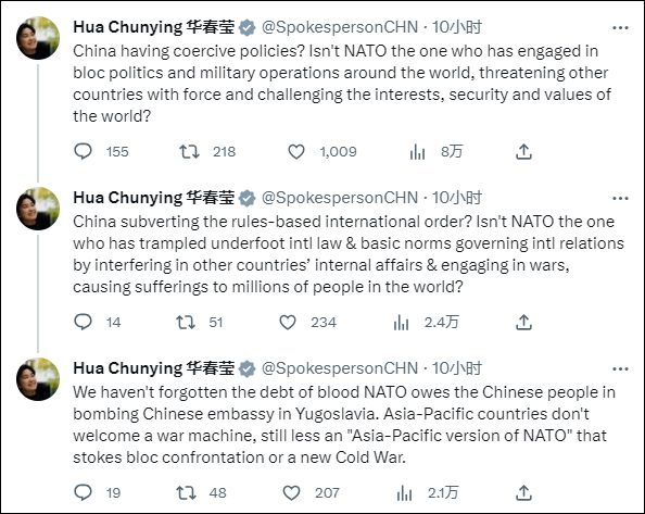 緊接着,她寫道:“我們沒有忘記北約轟炸中國駐南斯拉夫大使館所欠中國人民的血債。亞太國家不歡迎一個戰爭機器,更不歡迎一個引發集團對抗或新冷戰的‘亞太版北約’。”
