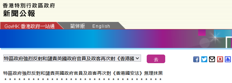 香港特區政府反對和譴責英政府官員及政客對香港國安法無理抹黑
