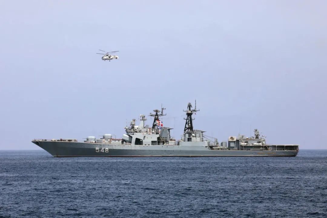 7月18日上午,由導彈驅逐艦齊齊哈爾艦、貴陽艦,導彈護衞艦棗莊艦、日照艦,以及綜合補給艦太湖艦組成的中方海上編隊抵達預定海域,與俄方參演兵力“特里布茨海軍上將”號、“潘捷列耶夫海軍上將”號、“齊堅扎波夫”號和“轟鳴”號會合,並完成中俄聯合戰役指揮部開設,為下一步按計劃開展“北部·聯合-2023”演習做好準備。
