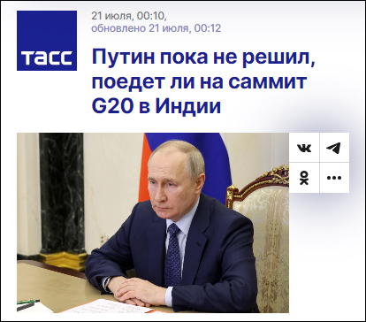 (觀察者網訊)據塔斯社消息,當地時間7月20日,俄羅斯總統新聞秘書佩斯科夫表示,俄羅斯總統普京尚未決定是否參加即將在印度舉行的二十國集團領導人峯會。