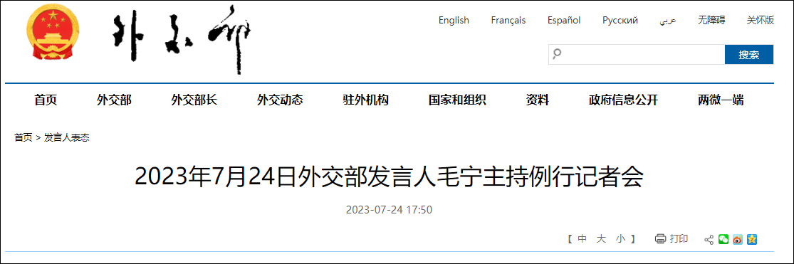 據外交部網站消息,2023年7月24日外交部發言人毛寧主持例行記者會。