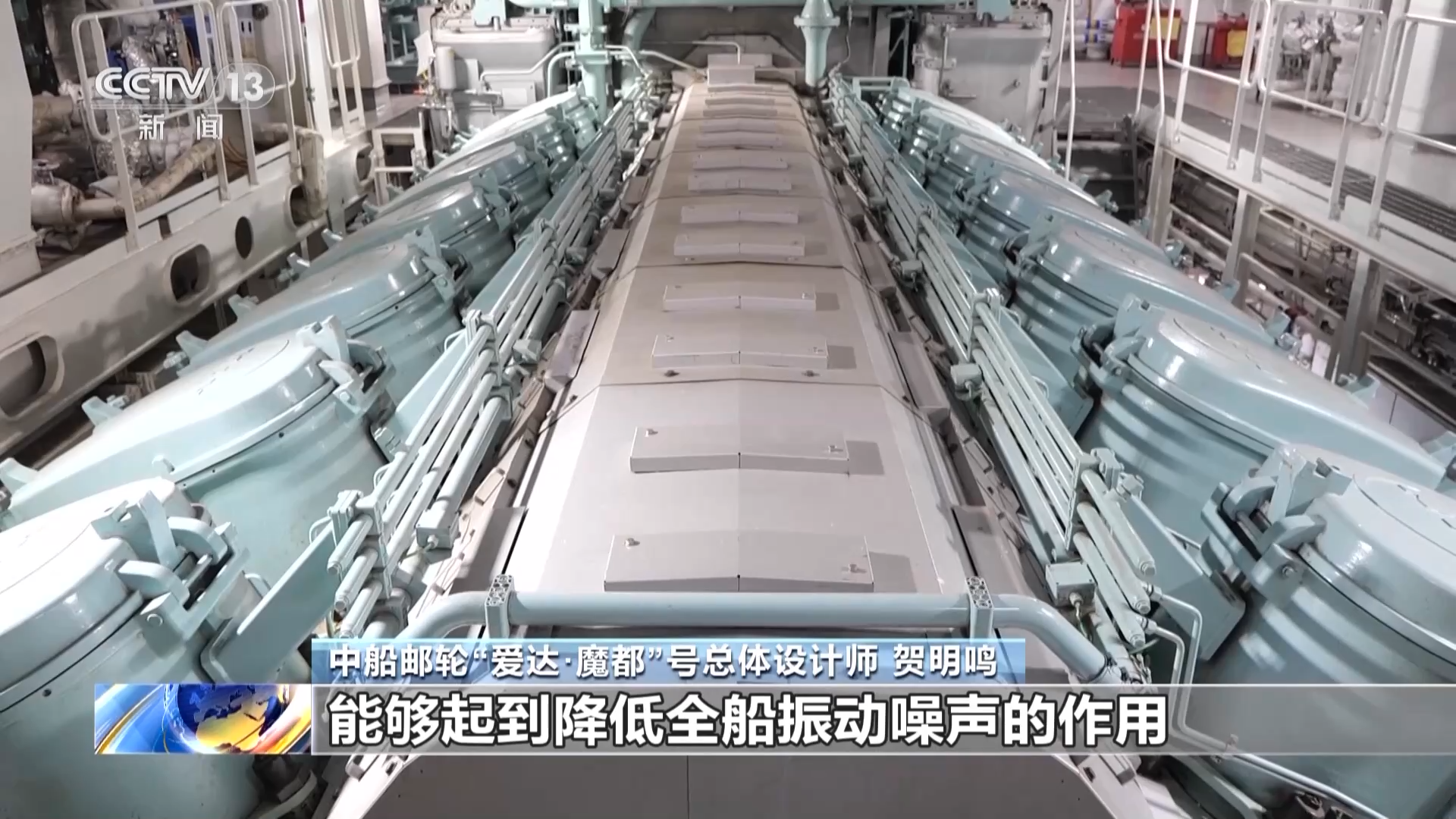 **中船郵輪“愛達·魔都”號總體設計師 賀明鳴:**我們還做了很多隔音措施,比如隔音棉、浮動地板以及主機基座下面的彈性基座,能夠起到降低全船振動噪聲的作用。