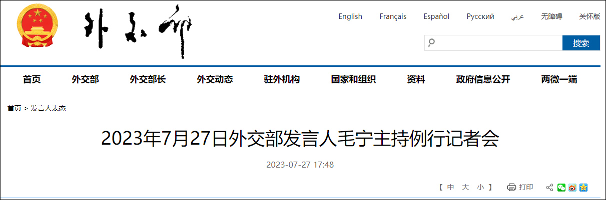 2023年7月27日外交部發言人毛寧主持例行記者會。