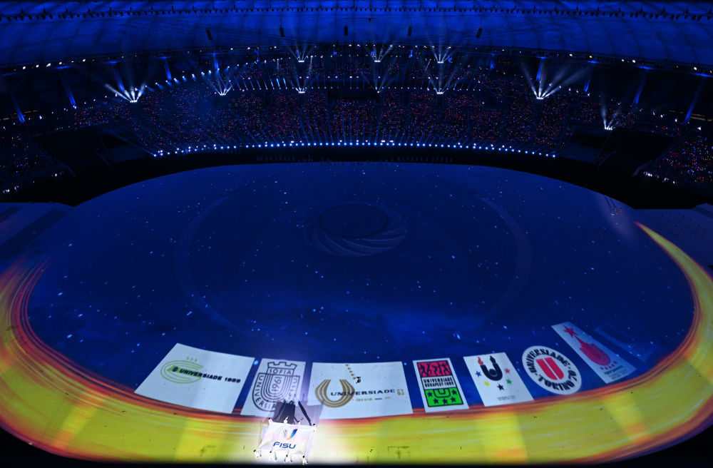 7月28日,國際大學生體育聯合會會旗在開幕式上入場。新華社記者劉磊攝
