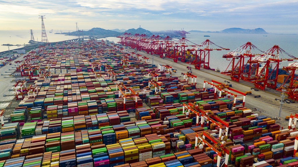 7月21日,上海洋山深水港自動化碼頭,多艘超大型集裝箱貨輪正在進行集裝箱吞吐作業/IC Photo