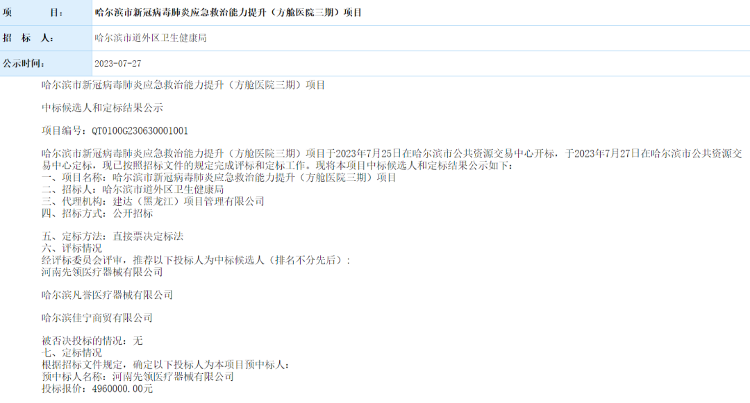 公開信息顯示,河南先領醫療器械有限公司最終以496萬元中標。公示期為7月27日至7月29日,公示三天後無異議即中標。也就是説,這個方艙醫院的項目至少在今年7月仍然在進行。