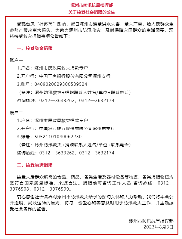 受強颱風“杜蘇芮”影響,近日涿州市遭受洪水災害,受災嚴重,給人民羣眾生命財產帶來重大損失。為助力涿州市防汛救災,及時保障災區羣眾的生活需要,現將接受救災捐贈事項公告如下: