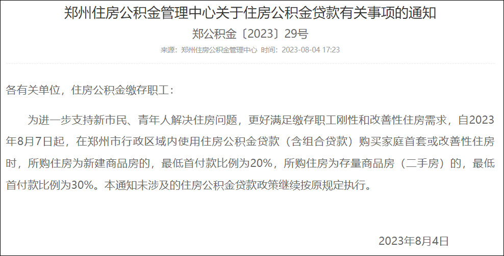 8月4日,鄭州住房公積金管理中心網站發佈關於住房公積金貸款有關事項的通知。自2023年8月7日起,在鄭州市行政區域內使用住房公積金貸款(含組合貸款)購買家庭首套或改善性住房時,所購住房為新建商品房的,最低首付款比例為20%。