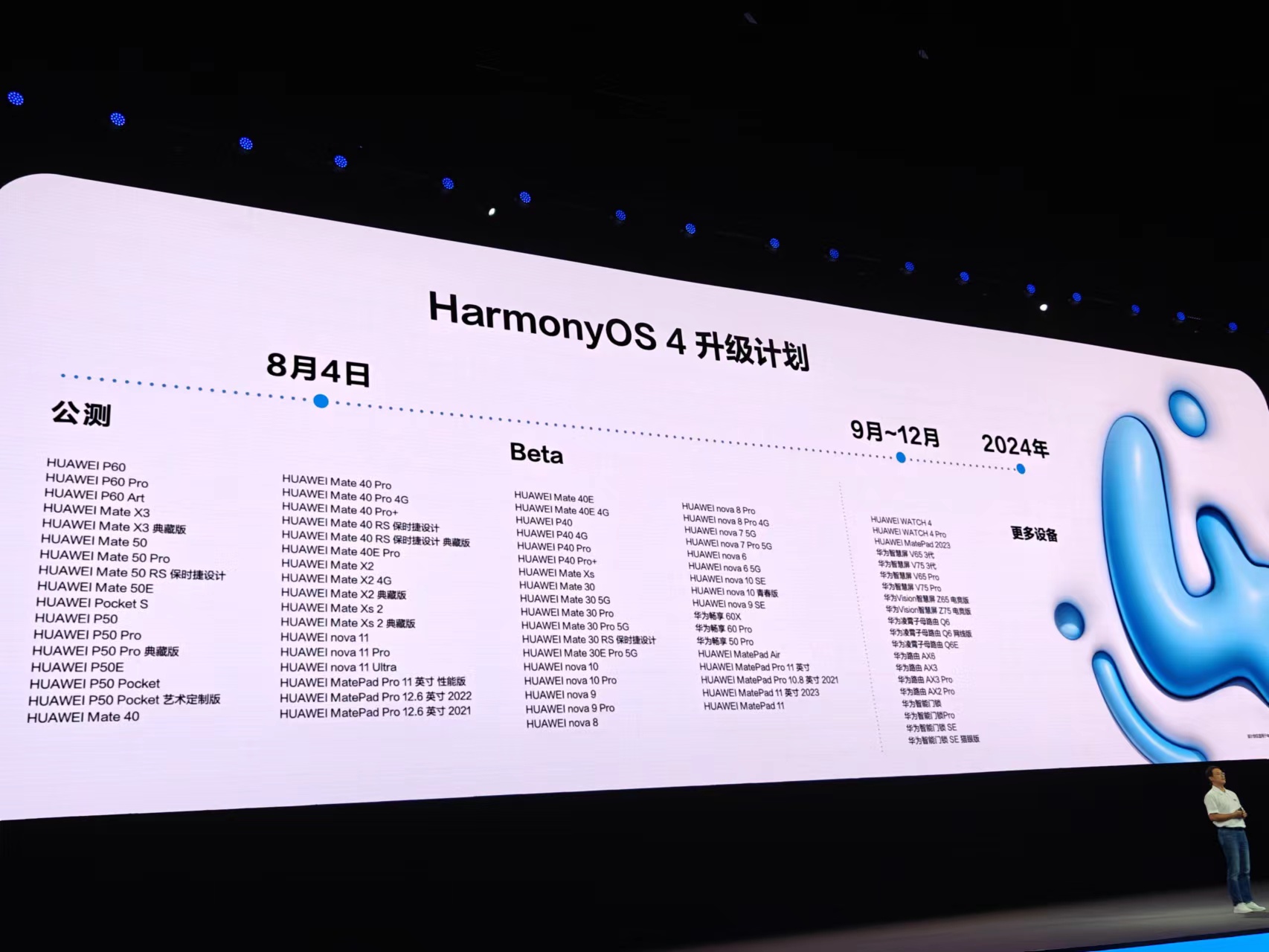 在大會現場,華為宣佈自8月4日HDC.Together發佈會當天起,將為HUAWEI Mate 50系列、HUAWEI P60系列、HUAWEI Mate X3、HUAWEI MatePad Pro 12.6英寸等34款產品啓動HarmonyOS 4公測升級,同時為HUAWEI P40系列、HUAWEI Mate 30系列以及HUAWEI nova 9、HUAWEI nova 10等35款產品啓動花粉Beta招募。