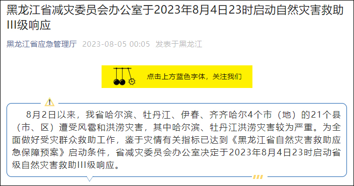 據微信公眾號“黑龍江省應急管理廳”5日消息,8月2日以來,黑龍江省哈爾濱、牡丹江、伊春、齊齊哈爾4個市(地)的21個縣(市、區)遭受風雹和洪澇災害,其中哈爾濱、牡丹江洪澇災害較為嚴重。為全面做好受災羣眾救助工作,鑑於災情有關指標已達到《黑龍江省自然災害救助應急保障預案》啓動條件,省減災委員會辦公室決定於2023年8月4日23時啓動省級自然災害救助III級響應。