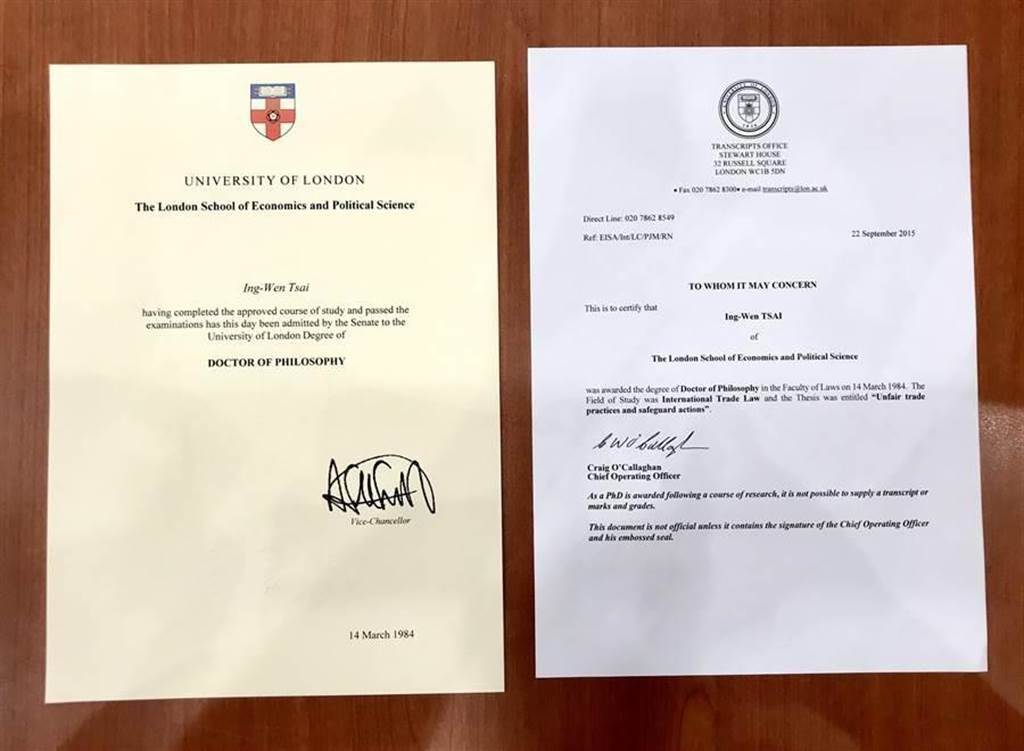 針對蔡英文“論文門”爭議,蔡英文辦公室2019年曾曬出蔡英文的學歷證明。(圖片來源:台灣“中時新聞網”資料照)