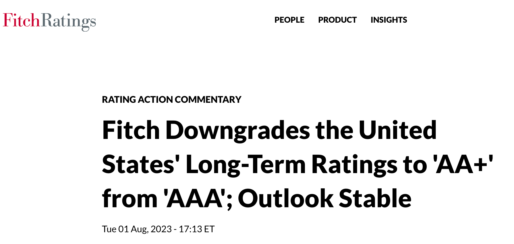 倫敦時間2023年8月1日,歐資信用評級機構惠譽國際(Fitch Ratings)宣佈,將美國的長期外幣發行人違約評級(IDR)從“AAA”下調至“AA+”,評級展望由負面轉為穩定,國家最高評級維持在“AAA”。這是惠譽自1994年首次發佈美國信用評級以來第一次下調美國評級。