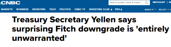 美國財政部長耶倫發表聲明,稱“我對惠譽評級公司的決定強烈反對。惠譽今天宣佈的降級是武斷的,並且基於過時的數據。惠譽的定量評級模型在2018年至2020年間大幅下降,然而儘管我們看到許多惠譽用於決策的指標取得了進展,惠譽卻在現在宣佈了這一結果。在本屆政府的領導下,包括通過跨黨派立法解決債務上限問題、投資基礎設施以及其他提升美國競爭力的投資等方面,許多這些指標,包括與財政治理有關的指標,都顯示出了改善的跡象。”