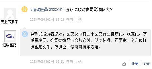 值得注意的是,在8月2日闢謠後隔日,恆瑞醫藥還在e互動平台表示,“醫藥反腐有助於醫藥行業健康化、規範化、高質量發展,公司始終嚴守合規底線,以高標準、嚴要求,全方位打造合規文化,促進公司健康可持續發展。此外,公司表示,目前公司日常經營管理和業務狀況一切正常。”