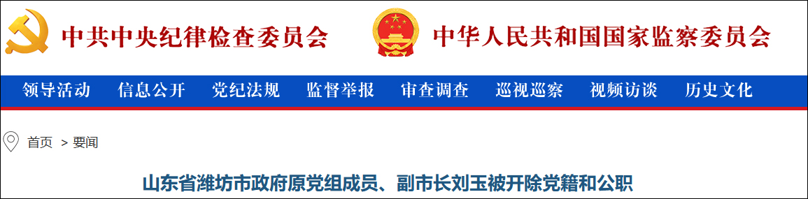 據中央紀委國家監委網站8月8日消息,據山東省紀委監委消息:經山東省委批准,山東省紀委監委對濰坊市政府原黨組成員、副市長劉玉嚴重違紀違法問題進行了立案審查調查。