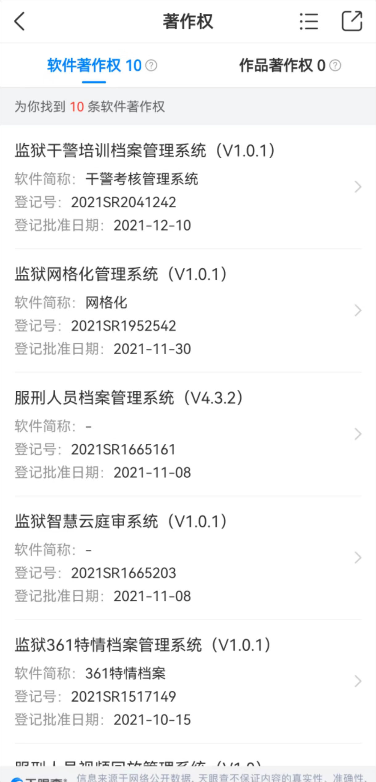 天眼查app顯示,立馳信息有多項軟件著作權涉監獄管理領域