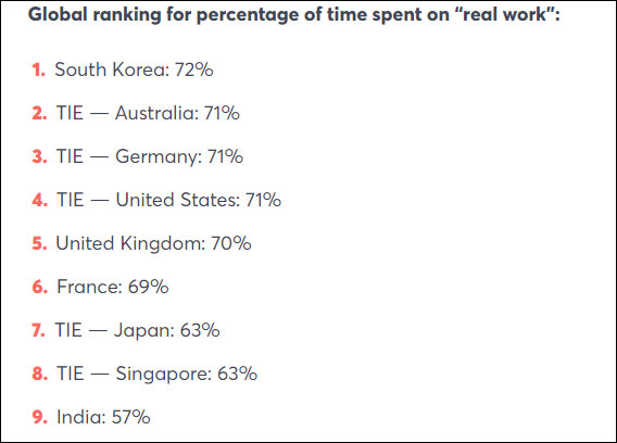 與此同時,印度、日本和新加坡的僱員在“實際工作”上花費的時間比例最低,韓國居首(72%),印度墊底(57%)。