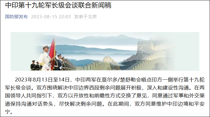 據微信公眾號“國防部發布”8月15日消息,8月13日至14日,中印兩軍在莫爾多/楚舒勒會晤點印方一側舉行第十九輪軍長級會談。雙方圍繞解決中印邊界西段剩餘問題展開積極、深入和建設性溝通。在兩國領導人共同指引下,雙方以開放性和前瞻性方式交換了意見,同意通過軍事和外交渠道保持溝通對話勢頭,儘快解決剩餘問題。在此期間,雙方同意維護中印邊境和平安寧。