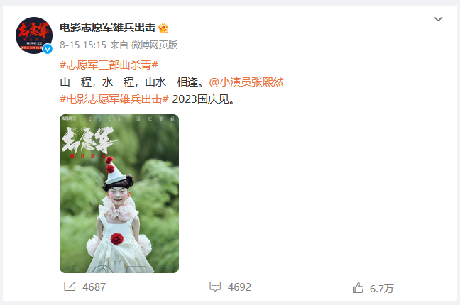@電影志願軍雄兵出擊 8月17日為幼年李曉殺青照爭議發文致歉。