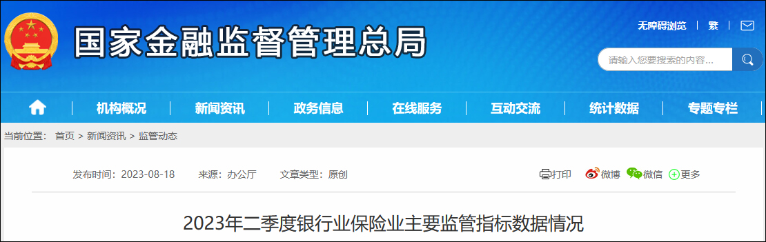 國家金融監督管理總局網站8月18日發佈2023年二季度銀行業保險業主要監管指標數據情況。