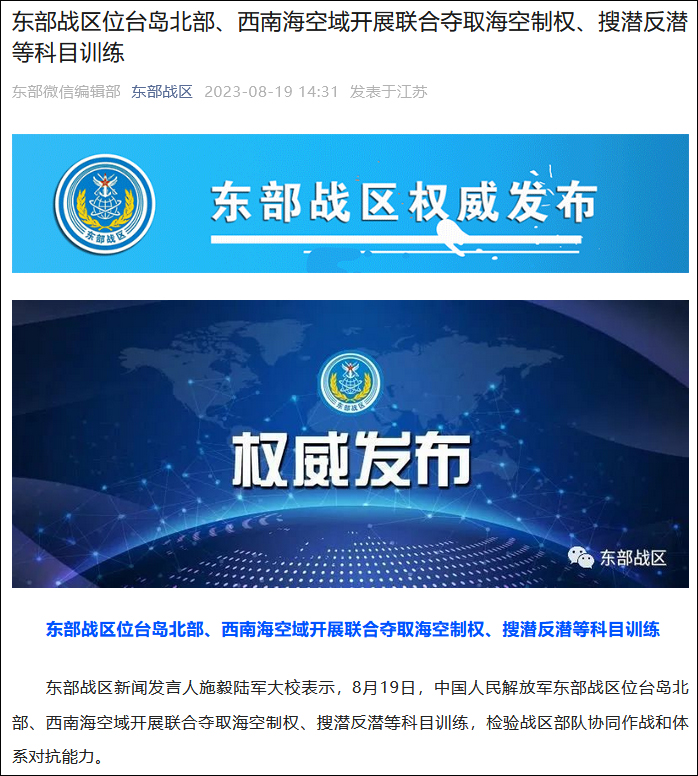 據微信公眾號“東部戰區”8月19日消息,東部戰區新聞發言人施毅陸軍大校表示,8月19日,中國人民解放軍東部戰區位台島北部、西南海空域開展聯合奪取海空制權、搜潛反潛等科目訓練,檢驗戰區部隊協同作戰和體系對抗能力。