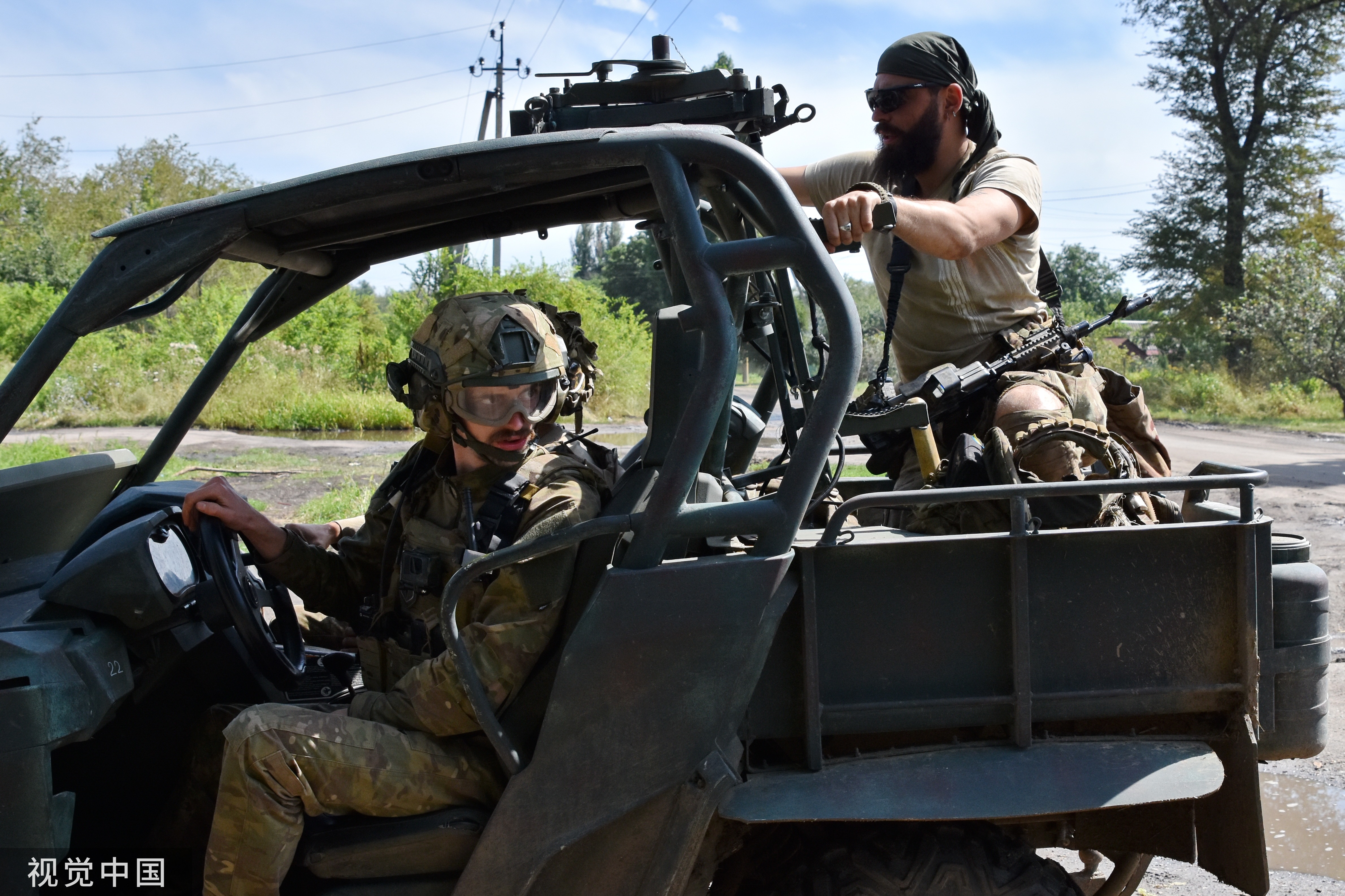 當地時間2023年7月19日,扎波羅熱地區,烏克蘭士兵乘坐一輛戰鬥車駛向前線。烏軍在戰鬥中使用了車頂裝有反坦克導彈系統的越野車。