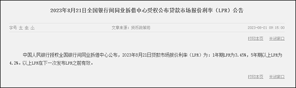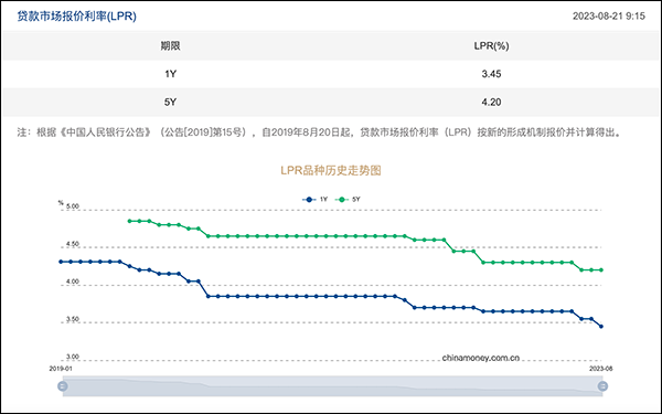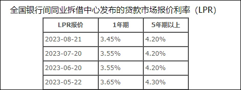 8月21日,中國人民銀行授權全國銀行間同業拆借中心公佈,2023年8月21日貸款市場報價利率(LPR)為:1年期LPR為3.45%,較上月下降10個基點,5年期以上LPR為4.2%,與上月持平。