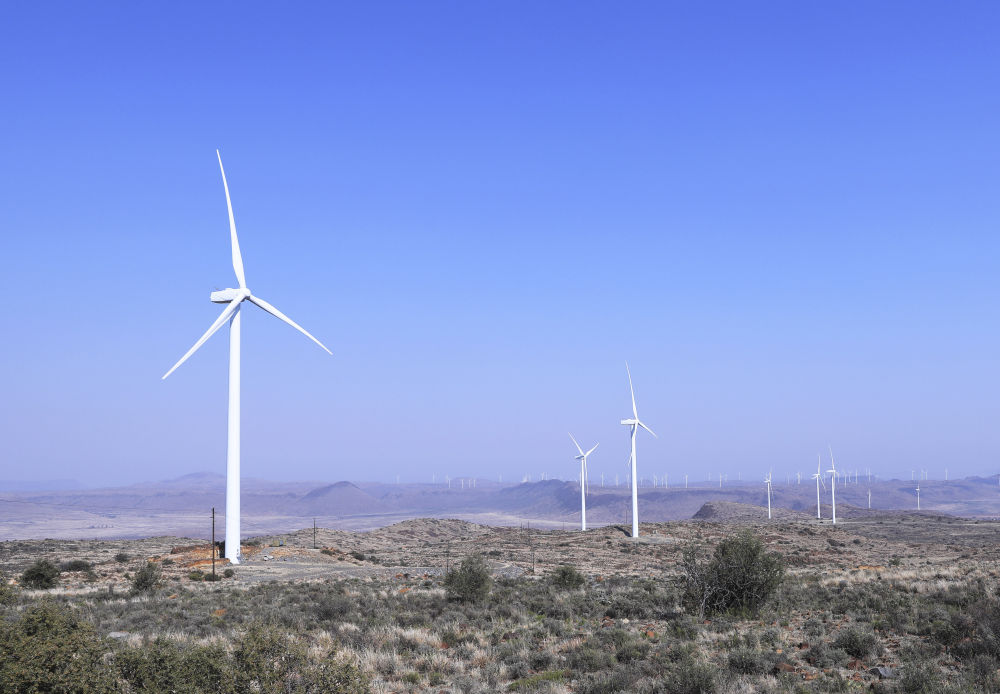 這是在南非北開普省德阿鎮拍攝的德阿風電項目風機(2023年8月10日攝)。由中國龍源電力集團南非公司運營的德阿風電項目每年發電量超過7.5億千瓦時,相當於節約20多萬噸標準煤,減排二氧化碳約70萬噸。