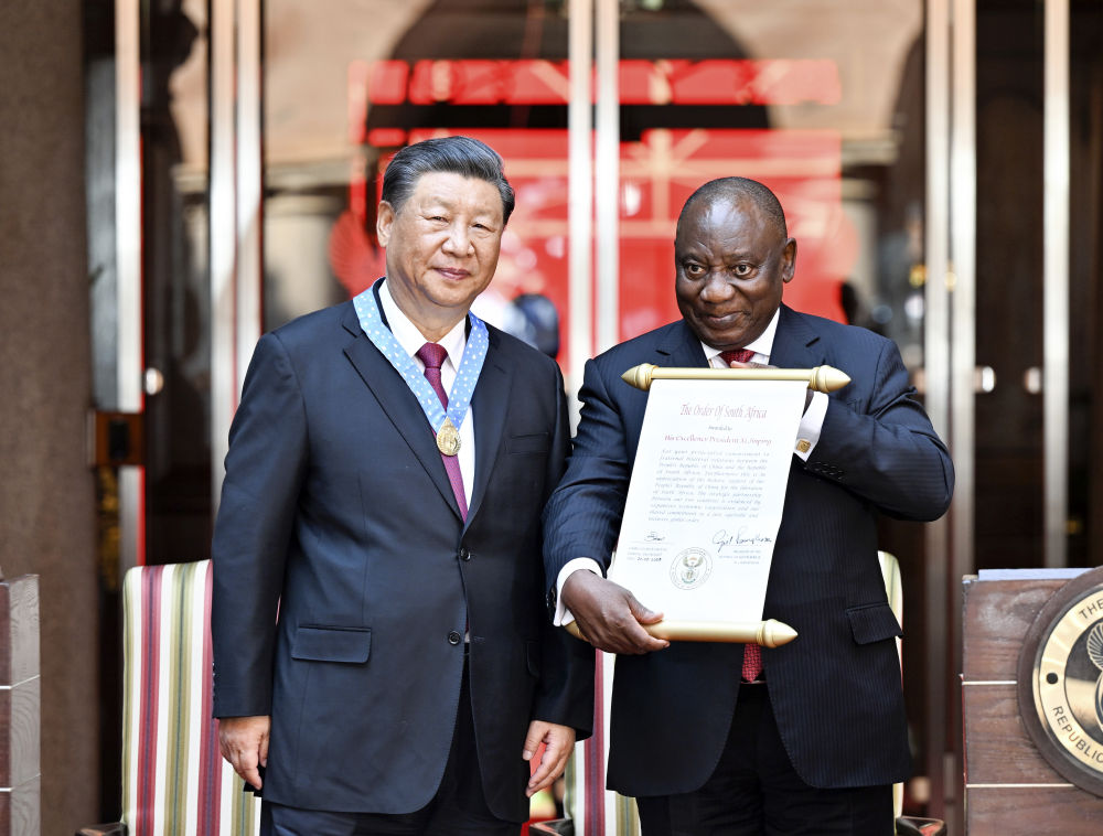 會談後,拉馬福薩向習近平授予“南非勳章”,這是南非授予重要友好國家元首的最高級別勳章和最高榮譽。