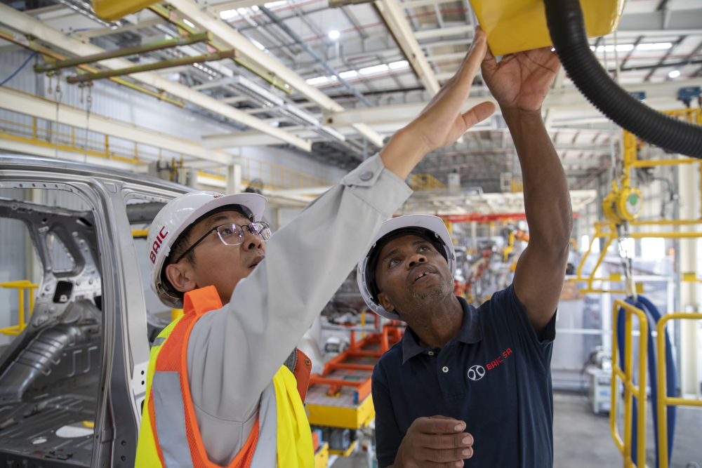 在南非東開普省北汽南非工廠,南非員工邦加尼(右)與中國同事方龍一起工作(2023年5月9日攝)。2022年,中國汽車品牌在南非的銷量突破3.5萬台,2023年預計將突破4萬台。