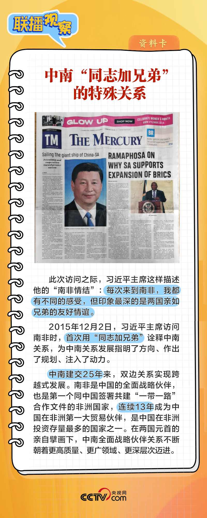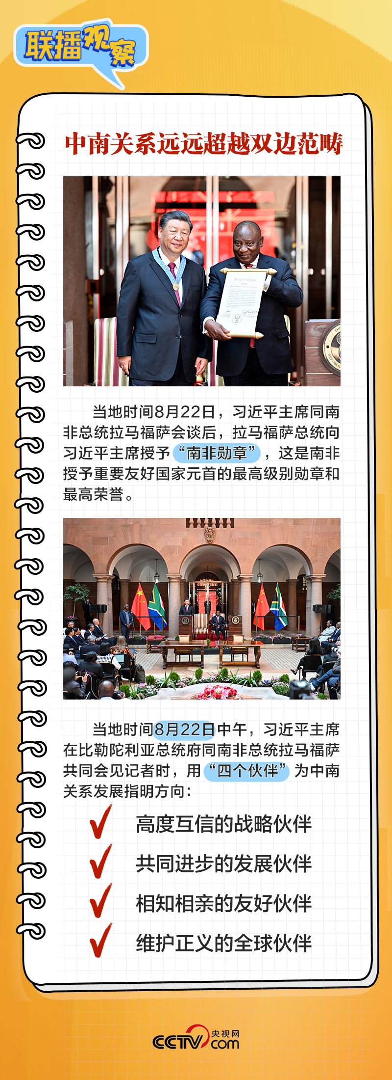 8月22日上午,在同南非總統拉馬福薩舉行會談時,習主席表示:“中南關係之所以好、中南友誼之所以深,關鍵在於兩國兩黨在各自發展道路上休慼與共,結下了同志加兄弟的深厚友誼。”