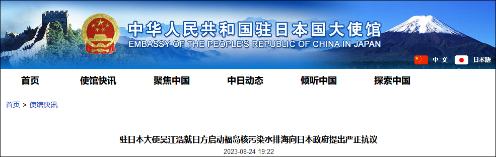 據中國駐日本大使館網站消息,8月24日,駐日本大使吳江浩就日方啓動福島核污染水排海向日本外務事務次官岡野正敬提出嚴正抗議。