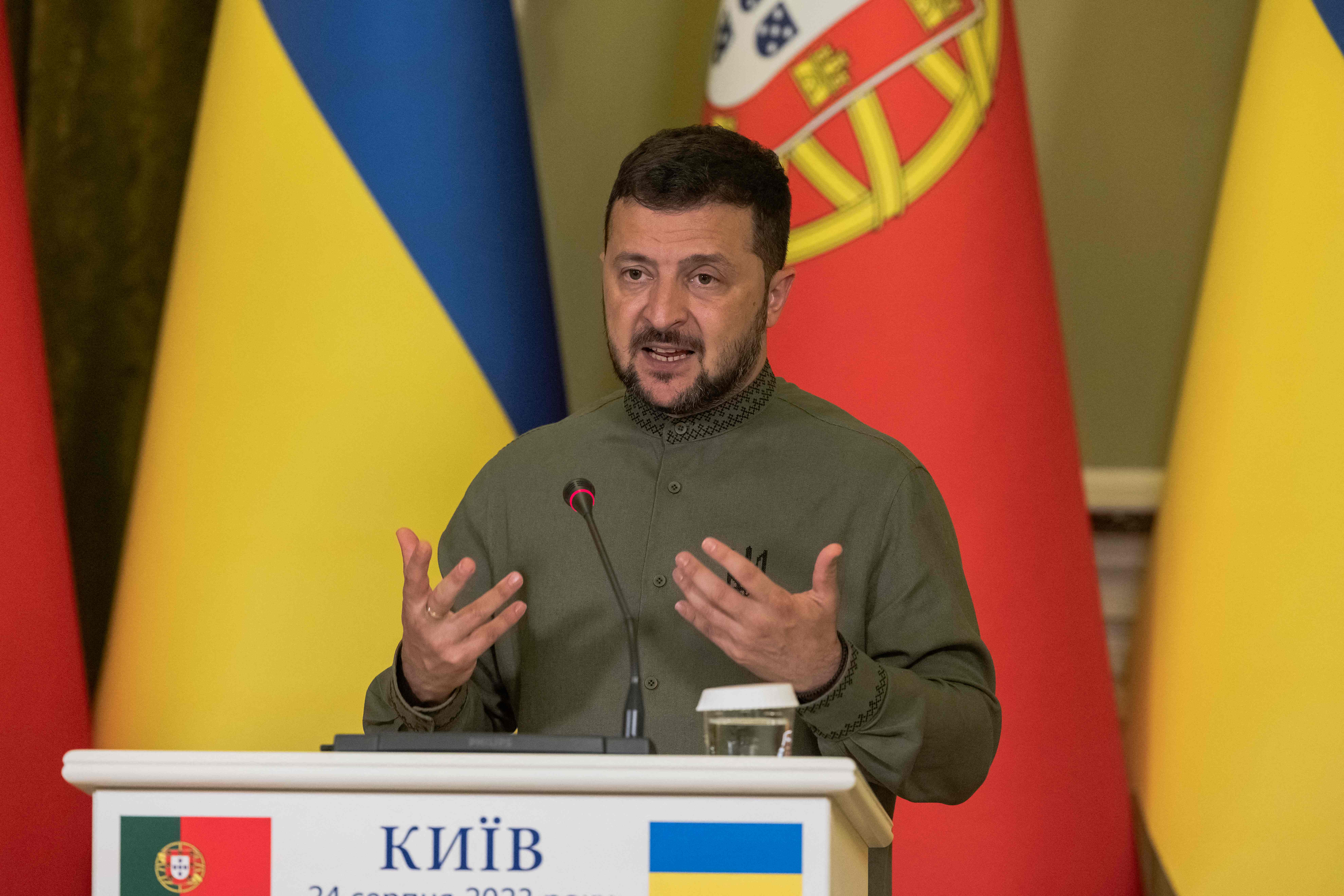 當地時間2023年8月24日,烏克蘭基輔,澤連斯基在與葡萄牙總統舉行的聯合新聞發佈會上發表講話。(圖源:視覺中國)