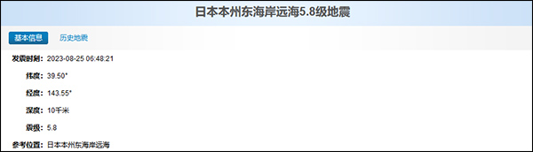 日本本州東海岸遠海發生5.8級地震 None 2023-08-25 據中國地震台網正式測定,北京時間8月25日6時48分在日本本州東海岸遠海(北緯39.50度,東經143.55度)發生5.8級地震,震源深度10千米。 截圖自中國地震台網 圖自@中國地震台網