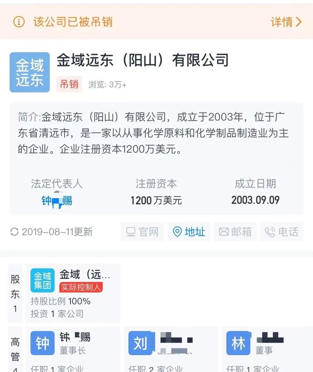 股東信息顯示,該公司由2001年3月成立的中國香港企業金域(遠東)集團有限公司全資持股,該公司後於2007年11月解散。另外,金域遠東(陽山)有限公司也已於2007年被吊銷。