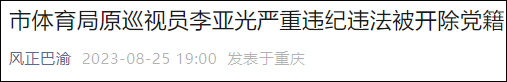 2023年2月,重慶市紀委監委發佈消息稱,重慶市體育局原巡視員李亞光涉嫌嚴重違紀違法,目前正接受重慶市紀委監委紀律審查和監察調查。