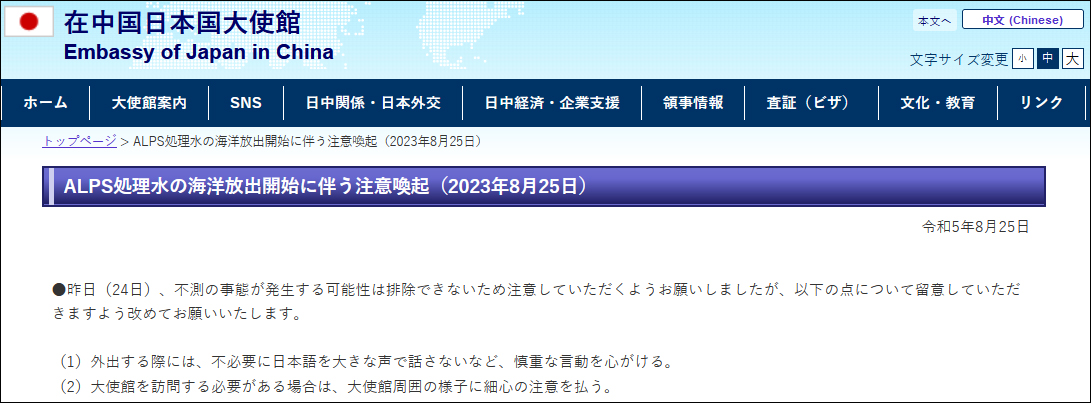 (觀察者網訊)日本駐華大使館網站日文版頁面8月25日發佈提醒稱,因不能排除發生不測的可能性,請再次注意以下幾點: