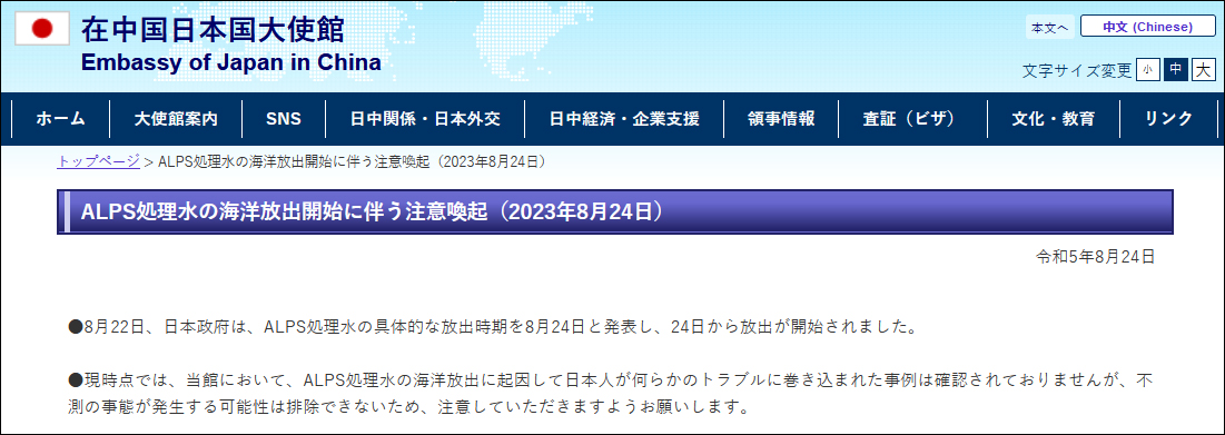 24日,日本駐華大使館就曾發佈聲明稱,8月22日,日本政府宣佈核污染水排海時間為8月24日。目前,日本民眾因核污染水排海而捲入糾紛的事件還未被確認,但不能排除發生不測事態的可能性,所以提請大家注意。