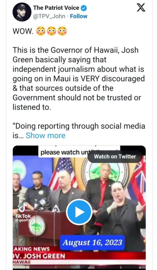 當然,這也惹怒了那些當事的政客。據“零對沖”(Zero Hedge)的報道,夏威夷州州長喬希·格林在最近的一次新聞發佈會上抨擊獨立媒體網絡大V,他説:“在社交媒體發佈新聞太愚蠢……不要使用社交媒體……不要依賴那些自詡為大V的人……離開你的手機,離開你的平板電腦……這裏是無媒體區!