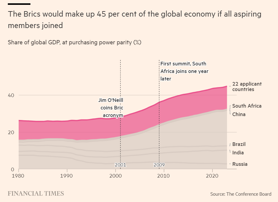 按購買力評價計算,金磚國家(灰)與22個申請國(紅)GDP佔全球之比變化圖 圖自:《金融時報》