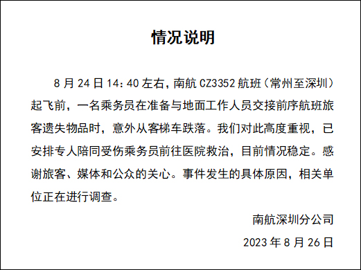 微信公眾號“南航深圳分公司”8月26日發佈情況説明稱,8月24日14:40左右,南航CZ3352航班(常州至深圳)起飛前,一名乘務員在準備與地面工作人員交接前序航班旅客遺失物品時,意外從客梯車跌落。南航對此高度重視,已安排專人陪同受傷乘務員前往醫院救治,目前情況穩定。事件發生的具體原因,相關單位正在進行調查。