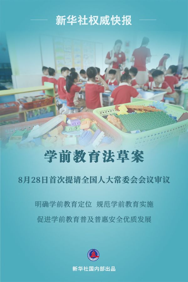 學前教育法草案8月28日提請十四屆全國人大常委會第五次會議初次審議。草案共八章74條,包括總則、規劃與舉辦、保育和教育、教師和其他工作人員、投入與保障、管理與監督、法律責任和附則。