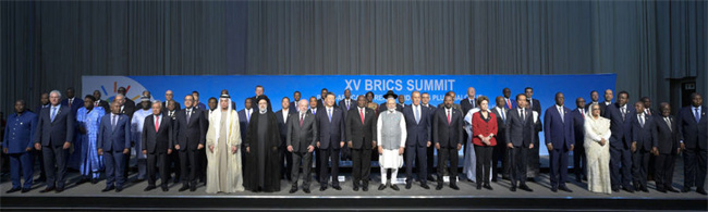 會議由南非總統拉馬福薩主持,巴西總統盧拉、印度總理莫迪、俄羅斯總統普京(線上)和60多位非洲國家及其他新興市場和發展中國家領導人或代表,以及聯合國秘書長古特雷斯、新開發銀行行長羅塞夫等國際和地區組織負責人出席。這是與會領導人集體合影。新華社記者 李學仁 攝