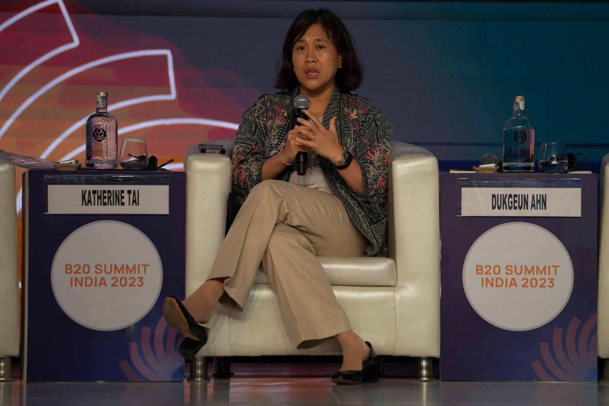 當地時間2023年8月25日,印度新德里,G20貿易投資部長與工商峯會聯合特別會議舉行,美國貿易代表戴琪發言。(圖源:視覺中國)