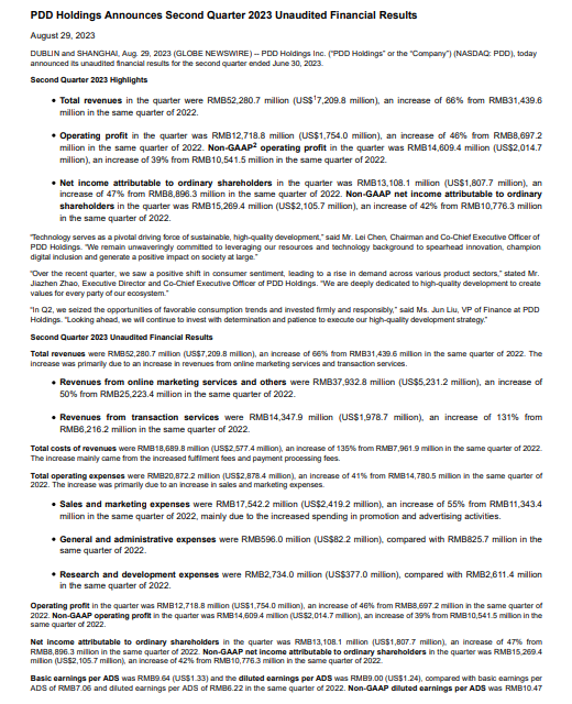 8月29日,拼多多集團發佈截至6月30日的2023年第二季度財報。