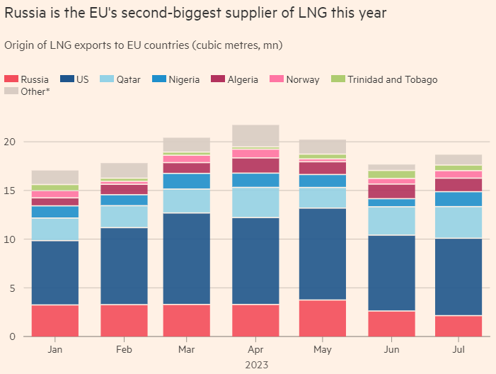 據英國《金融時報》8月29日報道,根據市場分析提供商Kpler的數據,今年1-7月,歐盟各國斥資約52.9億歐元(約合420億元人民幣)進口了2160萬立方米俄羅斯液化天然氣,進口總量比2022年同期增長約1.7%。